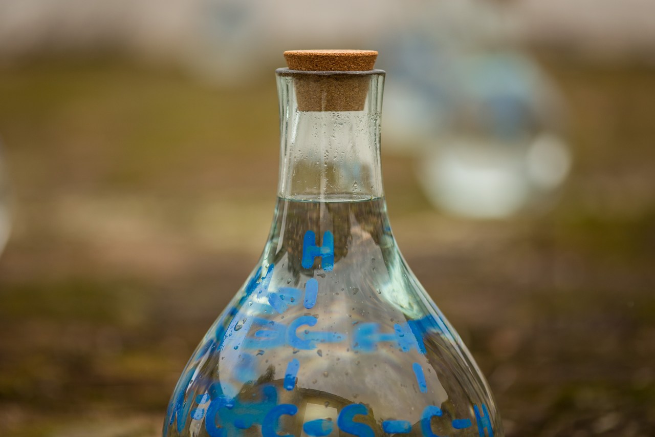 13 frascos de vidro com rolha de cortiça, 1 copo, 145 litros de água, inscrições com tinta esmalte vitral, pedra